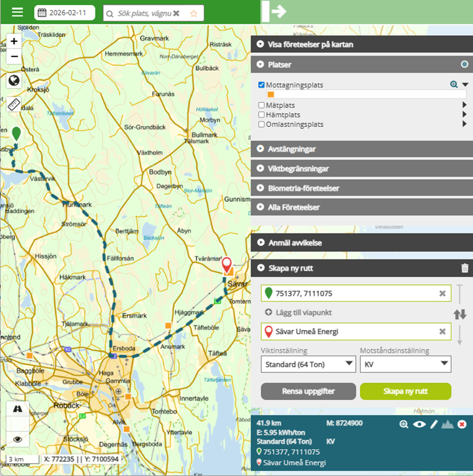The image shows a calculated route – green dashed line – for a standard vehicle from a pickup point in the forest to a processing plant in Sävar, north of Umeå. The distance is 41.9 km, and the energy value is 5.95 kWh/tonne.